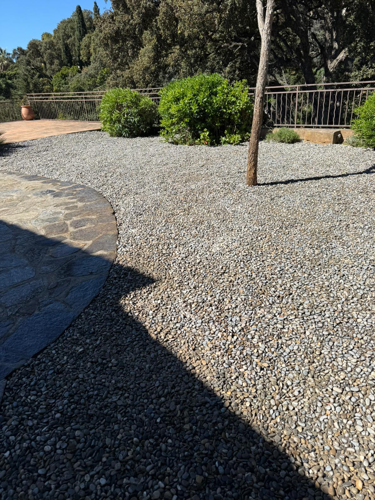Chez Bianchi Paysages, nous sommes fiers de vous présenter notre dernière réalisation d'aménagement extérieur à Bormes les Mimosas. Notre équipe de paysagistes expérimentés a transformé une cour grâce à l'utilisation de paillage en galets de la Durance, apportant à cet espace une esthétique naturelle et élégante.